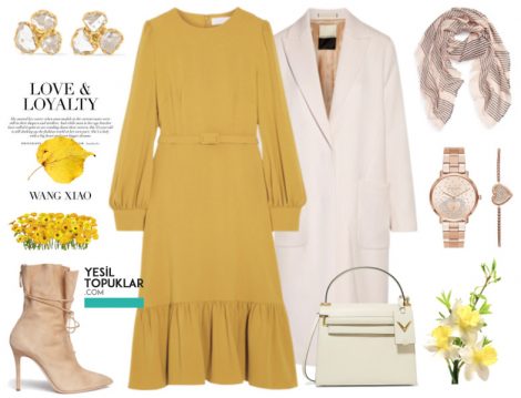 Sarı çuha çiçeği tonuyla tasarlanan uçuş uçuş maksi boy bir elbise tercihinizle, fındık kahvesi tonuyla maksi boy bir trençkotu kombinleyin. Yine nude ya da kahveye yakın tonlarda bir ayakkabı tercih eden. Elbisenizdeki sarı, kombininizdeki canlılığı tek başına sürdürsün. Eşarp seçiminizi ise floral ancak minimal desenlerdeki bir tasarımdan yana kullanabilir, kahve tonlarındaki tek renk bir şalla yalın silüetinizi bozmadan devam ettirebilirsiniz.