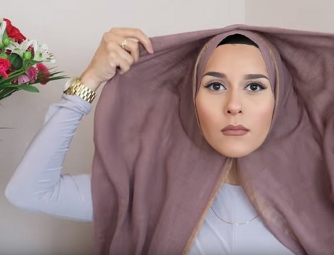 2. aşama: Dilediğiniz bir boneyi ya da iç başörtüsünü bağlayın. Pamuklu şalı yatay bir çimde tutun ve bağınızın ortasına hizalayıp yerleştirin.