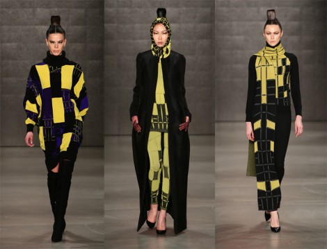 Defilede kullanılan saçlar kare kutu biçimini yansıtıyor. Geometrik desenler ile buluştuğunda siyah&sarı birleşimi gerçekten harika görünüyor.
