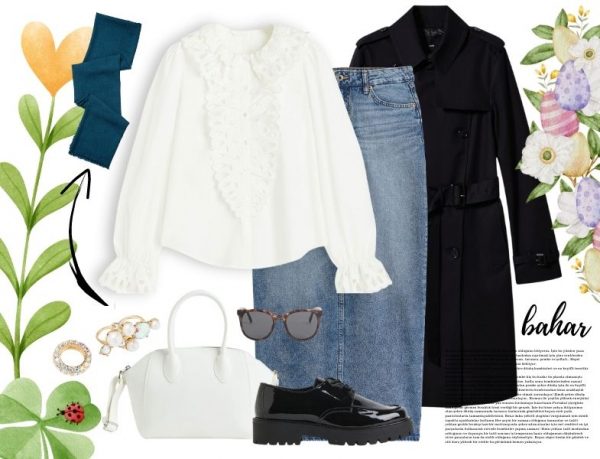 Çiçek desenli ve fırfırlı bir bluz ile bahara renkli giriş yapalım. Bol kesim, aynı derecede canlı bir etek ve açık renk trençkotla tamamladığımız kombine topuklu ayakkabılar ve mini bir çanta eşlik etsin. Yine canlı tonlarda bir şal, altın detaylı takılar ve işte baharın ilk feminen bluz kombini hazır.