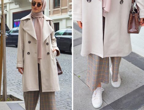 Ekose çizgileriniz arasından seçtiğiniz nude tonu, baş örtünüze ve paltonuz içinde kullandığınız gömleğinize yansıtın. Hafta sonu beyaz sneaker’lar ile ofise de süet kahve botlarla kombinleyin.