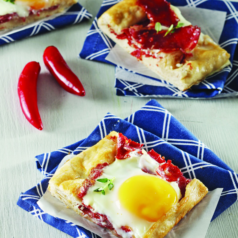 Üzeri için: 400 gr çemensiz pastırma, 1 yemek kaşığı tereyağı, 3 yumurta, 1 yumurta sarısı