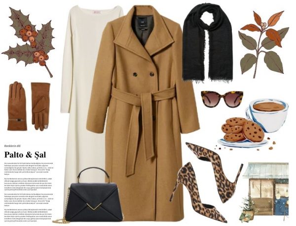 Kahve tonlarında bir palto ile uyumlu şal renkleri bej, kahverenginin açık ya da koyu tonları (ton sür ton severler için) ve mavidir. Ancak kombinin şıklık seviyesini biraz arttırmak istiyorsanız kahverengi paltonuzu siyah bir şal ile bir araya getirmeyi deneyin.