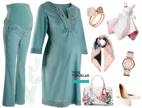 Günlük Kombin: Bol paça hamile pantolonunuzun üzerine minimum dizlere kadar inen, robadan bluz. Bluz desenli ise düz, bluz düz ise desenli şal/eşarp. Rahat ve ortopedik bir spor ayakkabı. Tercih üzerine dış giysi olarak ferace. Ferace giyildiği takdirde bluz yerini daha rahat pamuklu bir tişörte bırakabilir.