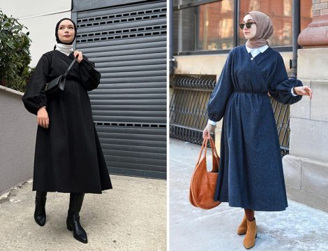 Sezonun en sıcacık parçaları arasına adını yazdıran yün elbiseler, soğuk günlerin keyifli parçalarından. Tesettürlü kadınların dolaplarında mutlaka bir tane yer alması gereken tasarımlardan, özellikle belden oturan A kesim modeller, lastik kollu detaylar – soğuk havayı almaması açısından – öne çıkıyor. Minik Terzi’nin tasarımı anvelop yün elbise de Şüheda Türkoğlu ve Elif Doğan’ın kombinleriyle sezonun iyileri arasına yerleşiyor.
