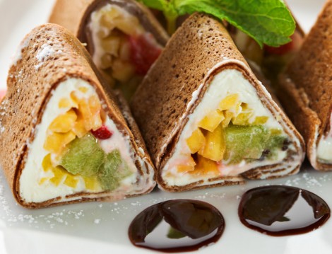 Pişen kreplerden birini tezgaha alın ve içine dilediğiniz ölçüde krem peynir ve bal sürün. Üzerlerine küp küp doğradığınız mevsim meyvelerinden ilave edin. Bir ucundan başlayarak muntazam bir biçimde sarın. Üçgen form vermek için hafif yanlardan bastırın. Dilerseniz yuvarlak olarak da servis yapabilirsiniz. Son olarak dilimleyin ve servis tabağına alın, çikolata sosu ile süsleyerek sunum yapabilirsiniz.
