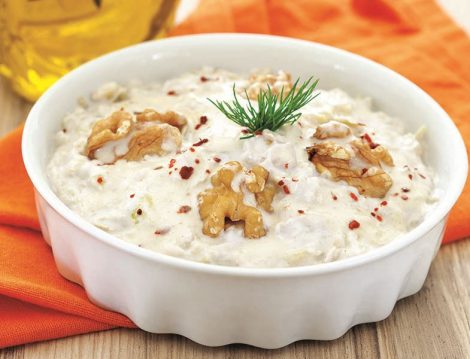 Kabakları rendeleyip suyunu sıkıp, bir tavada zeytinyağı ve tuz ile 10 dakika kadar soteleyerek soğumaya bırakın. Derin bir kasede yoğurt, tahin, ezilmiş sarımsak ve iri kırılmış cevizi karıştırın. Servis etmeye yakın kabakların üzerine yoğurt sosu dökün. Üzerine ceviz ve pul biber serperek servis edin.